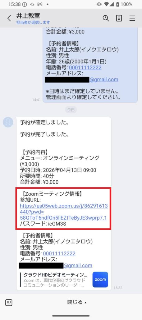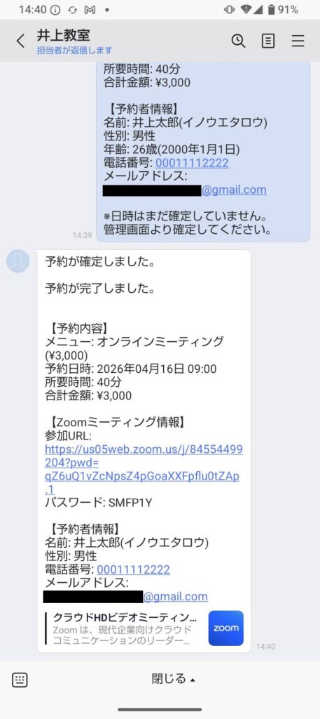 ・予約者に送信される「予約確定通知」にZoom URLが記載されます。