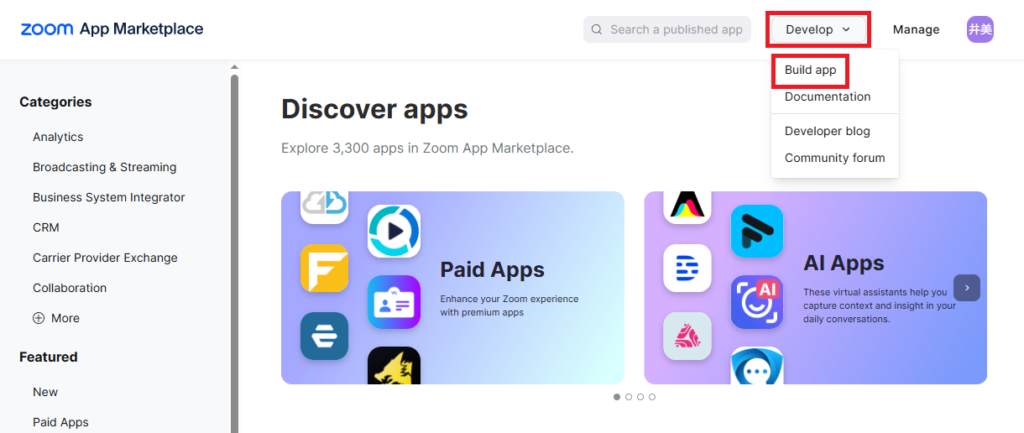 ・ページ上部の「Develop」のプルダウンから、「Build up」を押します。