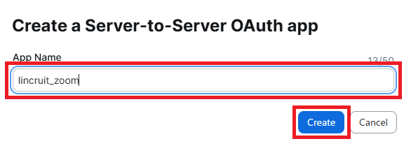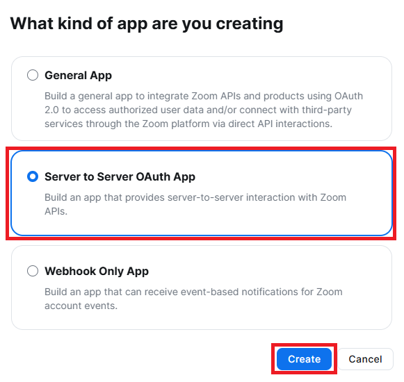 ・「Server to Server OAuth App」を選択し、「Create」を押します。