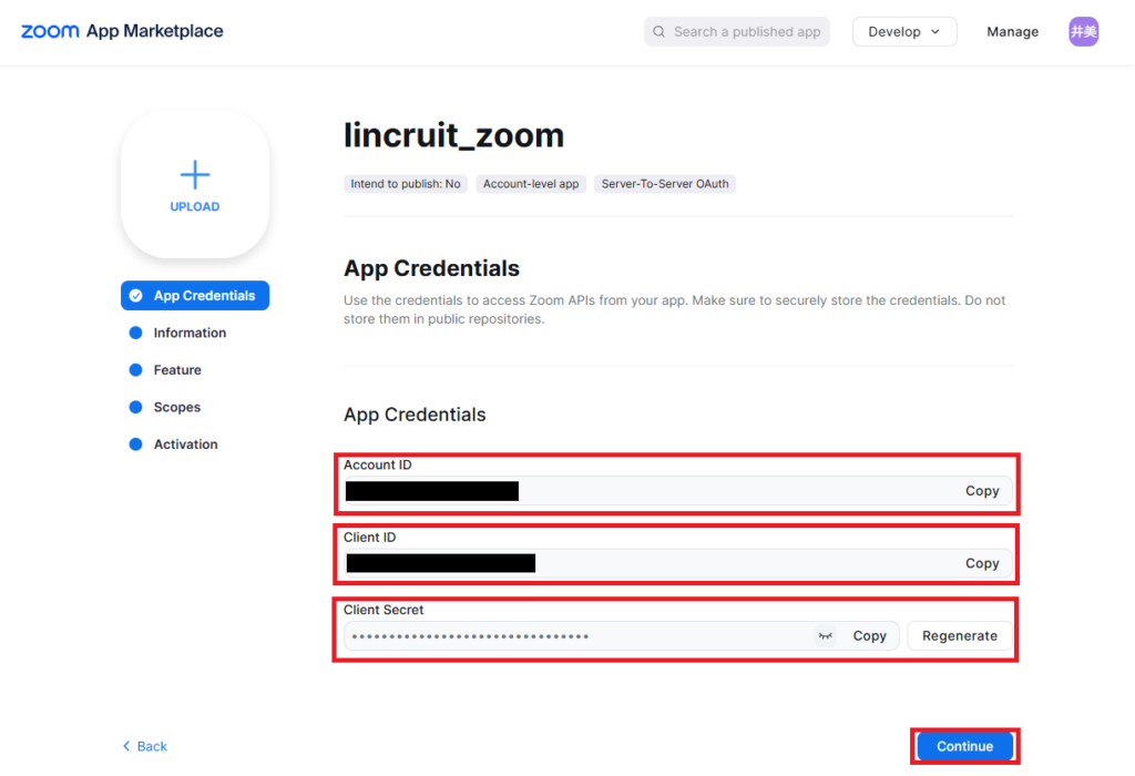 手順⑤「App Credentials」から Account ID、Client ID、Client Secret をコピー