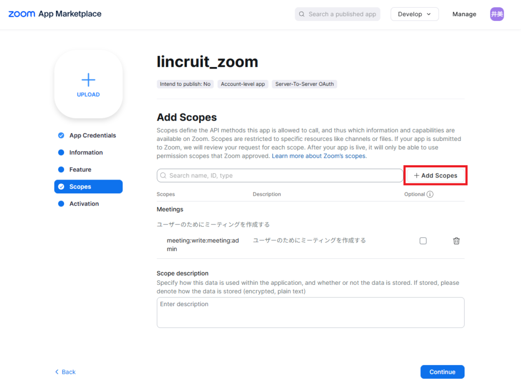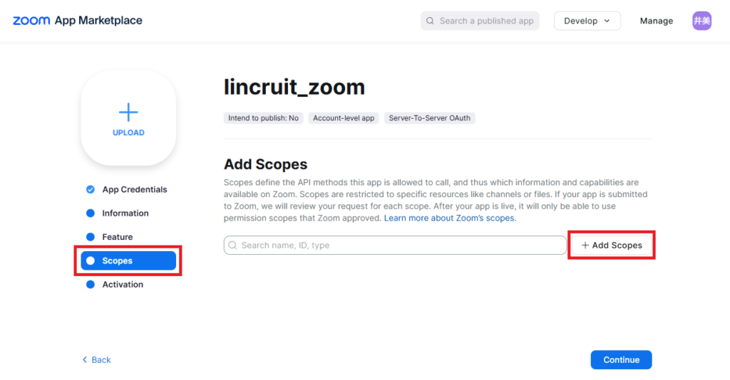 ・もう一度「Add Scopes」を押し、2つ目を検索バーで検索します。