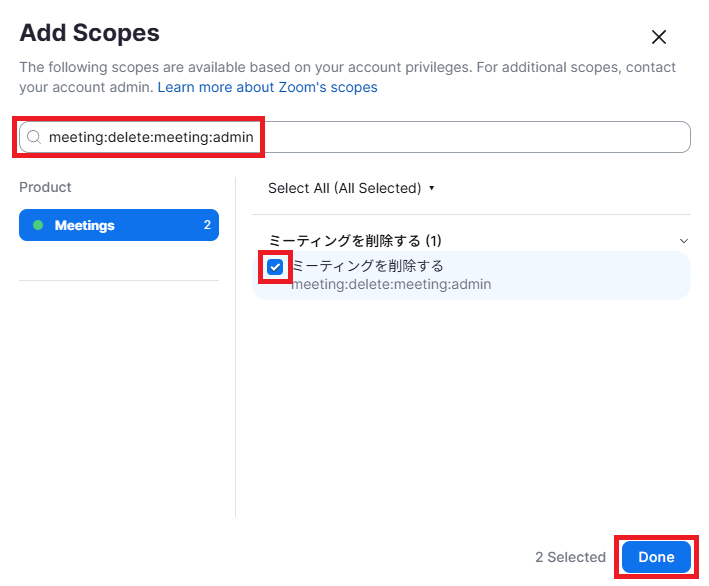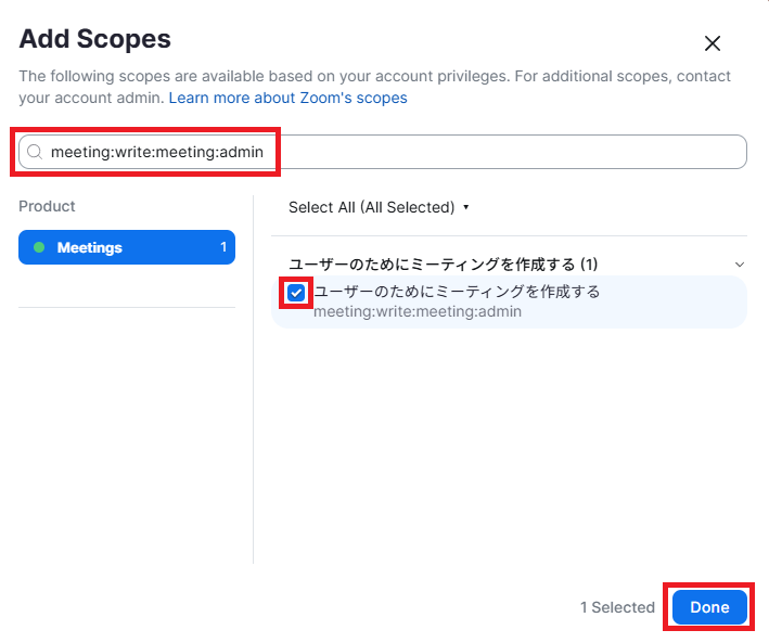 ・検索バーで、追加するうちの1つの「meeting:write:meeting:admin」を検索します。