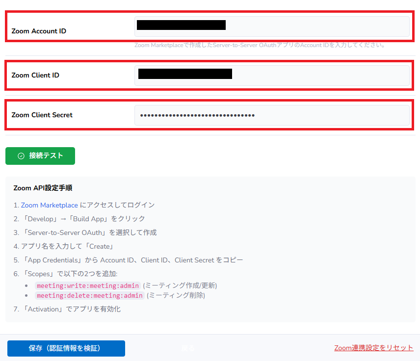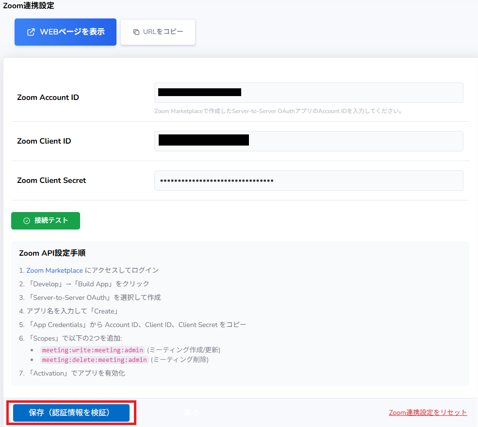 リンクル管理画面で、「保存(認証情報を更新)」を押すことで、Zoom連携機能の設定が完了します。