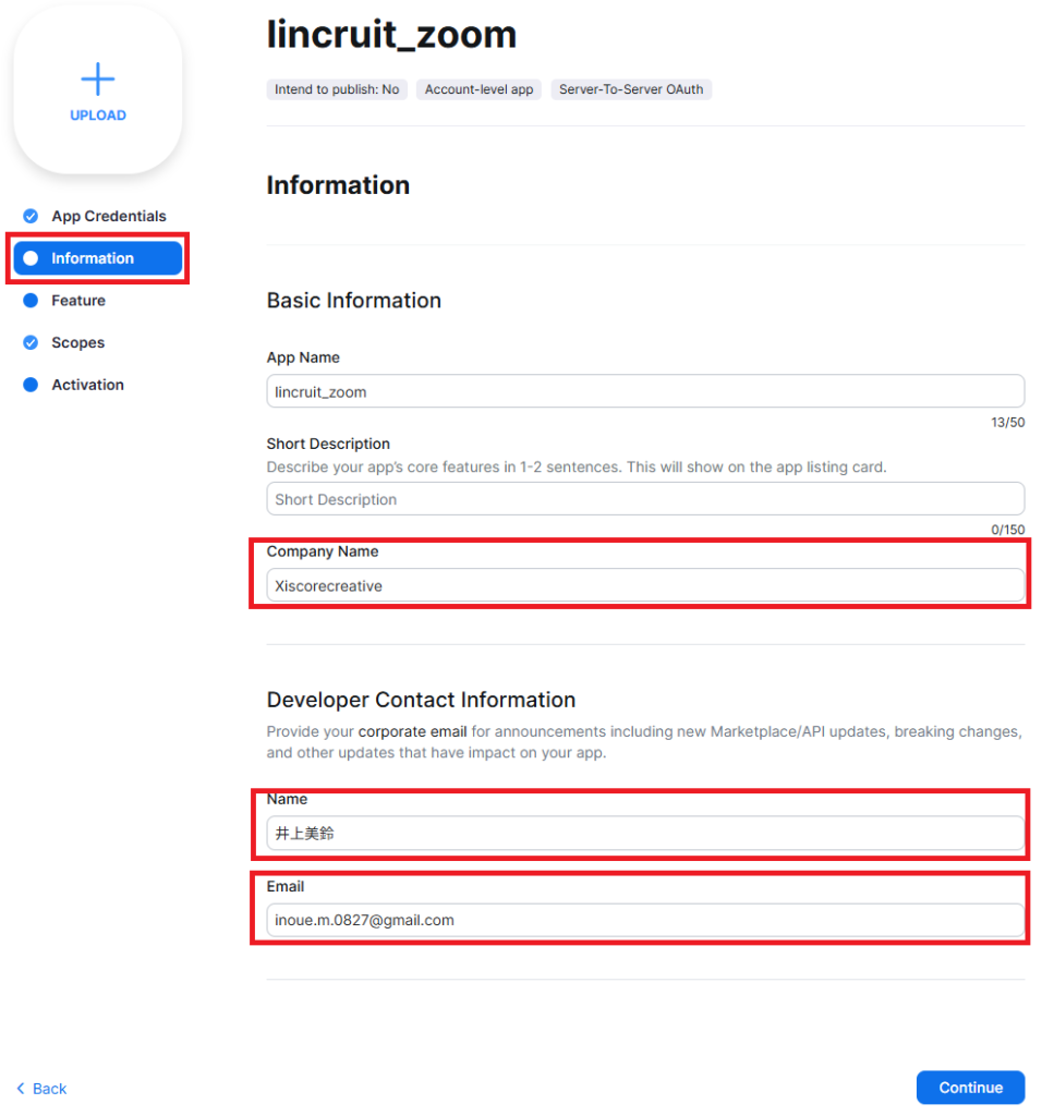 ・「Information(情報)」で、「Company Name(会社名)」「Name(名前)」「Email(メール)」を入力してください。