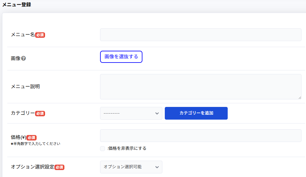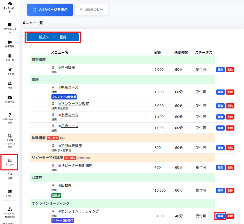 「メニュー」の「新規メニュー登録」か、Zoom連携したいメニューの「編集」から、「メニュー登録」画面を開きます。