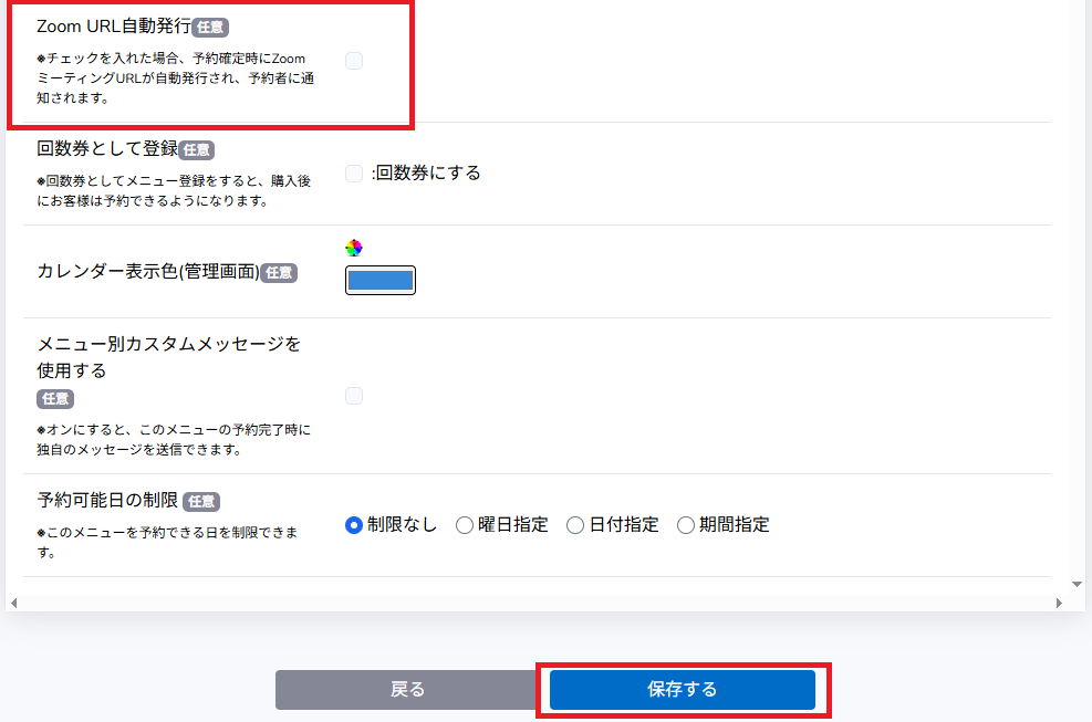 ・チェックを入れると、予約確定時にZoomミーティングURLが発行され、予約者に通知されます。