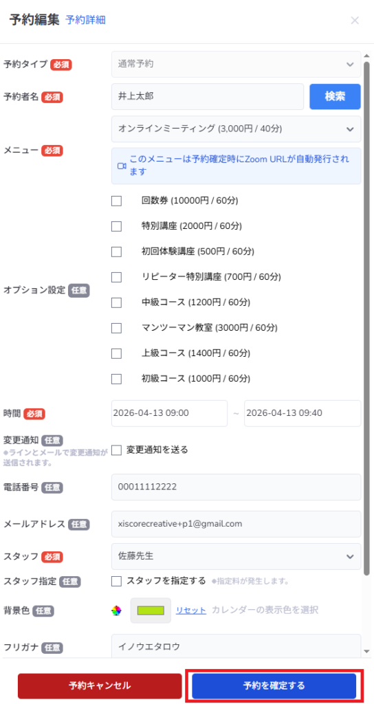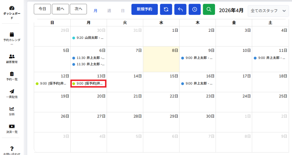「予約カレンダー」の[仮予約]を「予約を確定する」を押して予約確定させます。