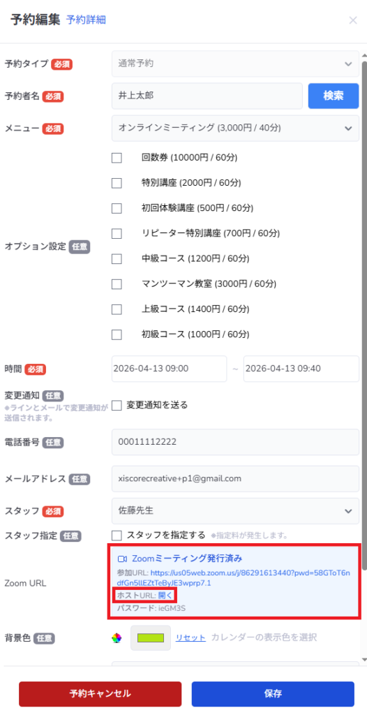・管理者は「予約編集」「予約詳細」「予約確認」からZoom URLの確認ができます。