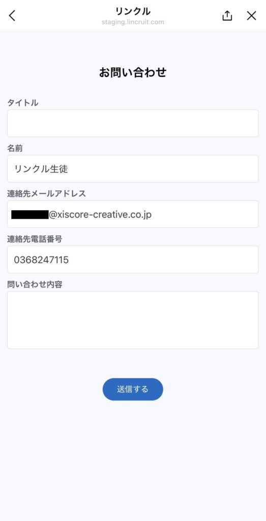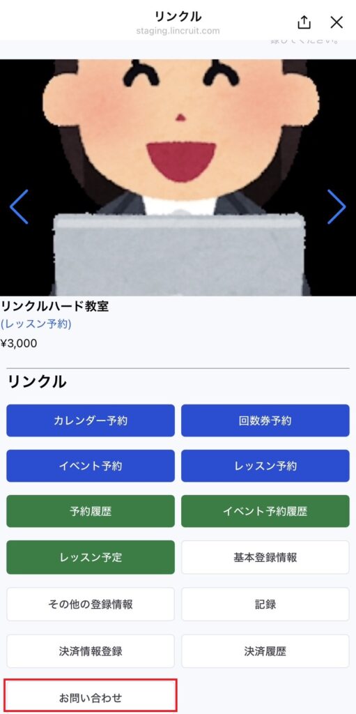 「お問い合わせフォームに表示する」にチェックを入れた場合は、リッチメニューから予約ボタンを選択し、表示されるページ下部に「お問い合わせ」が表示され、チェックを入れない場合は表示されません。