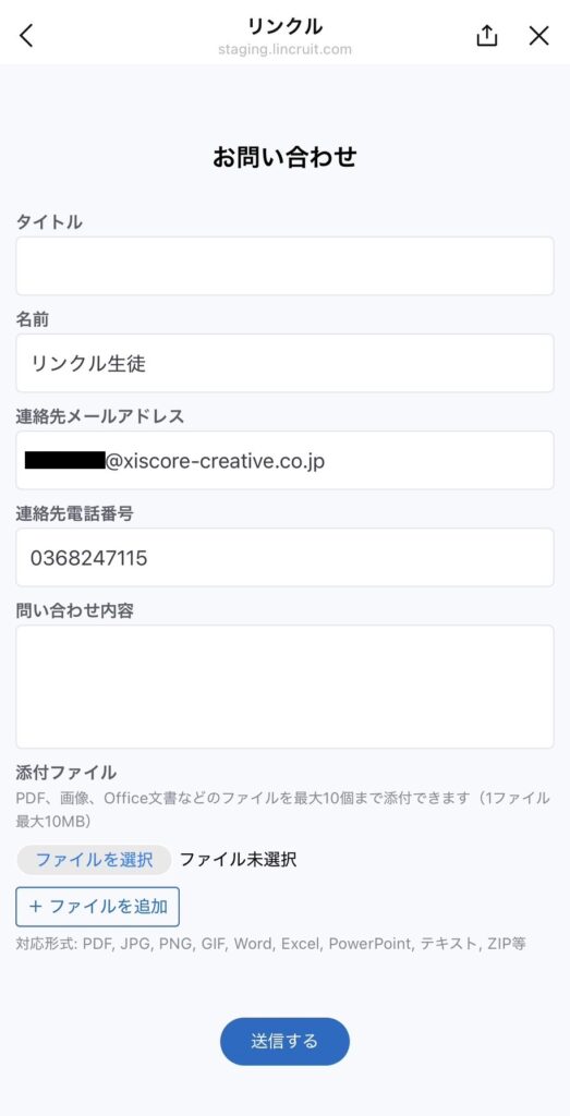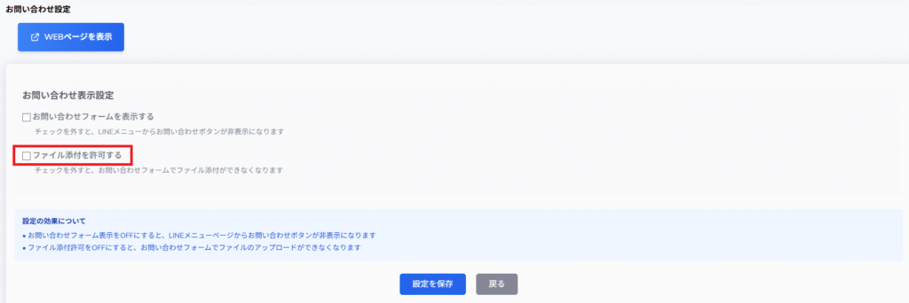 「ファイル添付を許可する」にチェックを入れた場合は、お問い合わせ画面でファイル添付項目が表示され、チェックを折れない場合はファイル添付項目が表示されません。