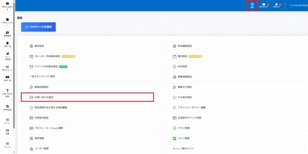 リンクル管理画面右上の「設定マーク」から、「お問い合わせ設定」を選択し、設定したい内容になるようにチェックを入れ、「設定を保存」を選択することで泳い合わせの表示設定が完了します。