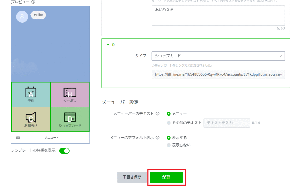 画像の内容に該当する場所のアクションで、「タイプ」を「ショップカード」に設定すると、自動的にリンクが設定され、リッチメニューにショップカードの設定が完了します。