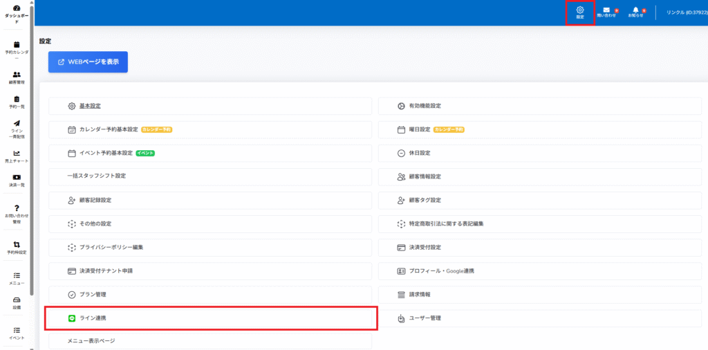 ①管理画面にログインし、右上の「歯車マーク」から、「ライン連携」を選択します。