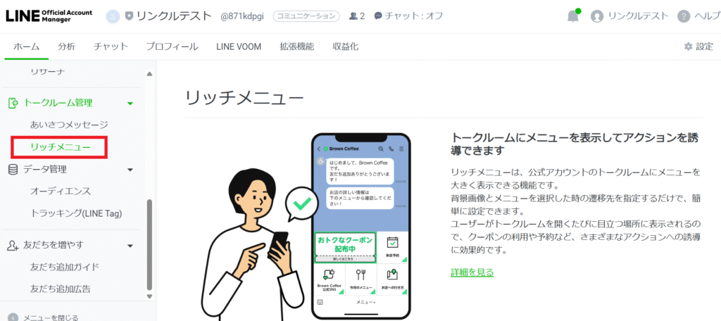 公式LINEの管理画面の左下から、「リッチメニュー」を選択し、ページ下部の「作成」から、リッチメニューを作成します。
