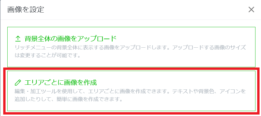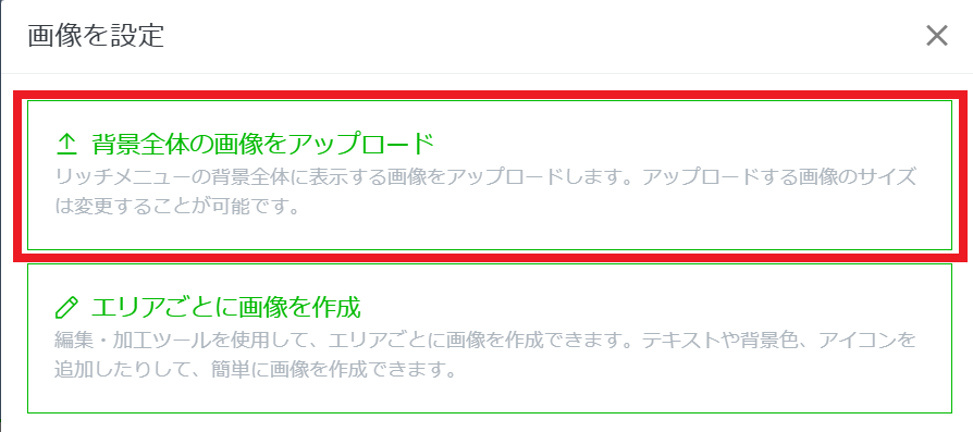 canvaなどで「LINEリッチメニュー」などと検索してダウンロードし、ダウンロード画像に合うテンプレートを選択し、「背景全体の画像をアップロード」から、設定したい画像を選択することで画像の設定が完了します。