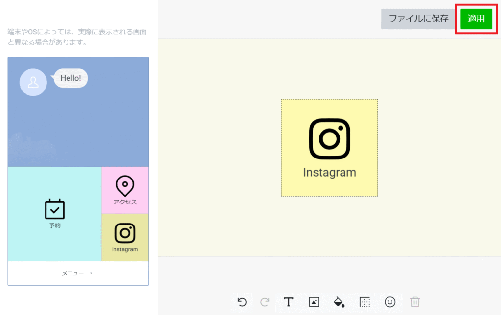 ②エリアごとに絵文字やテキスト、画像を挿入し、「適用」を選択し、リッチメニューの画像設定が完了します。