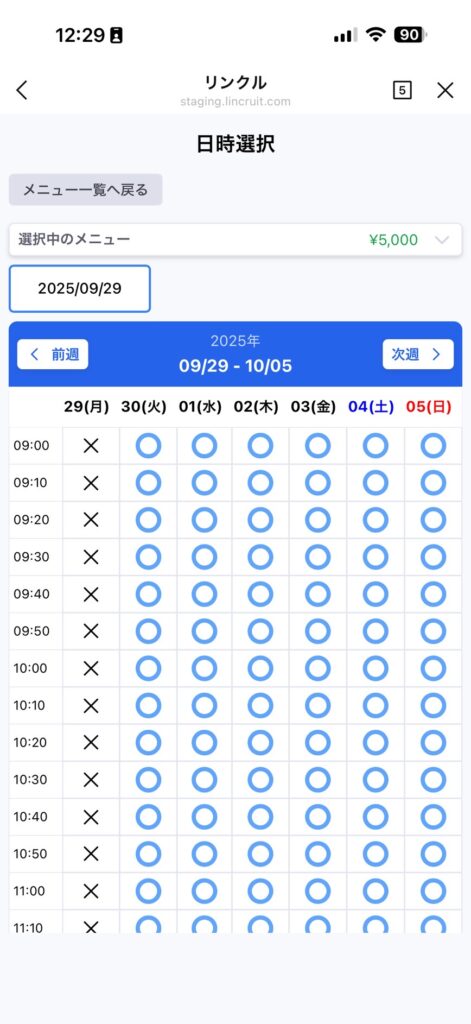 メニューそれぞれに設定した所要時間が表示され、刻み時間を10分ごとに設定しているため、カレンダー予約画面が10分ごとに刻まれて表示されます。