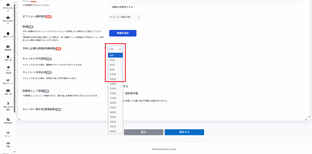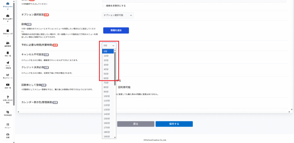 メニュー作成画面の所要時間の刻み時間が10分毎になり、10分、40分、50分の設定ができるようになっています。