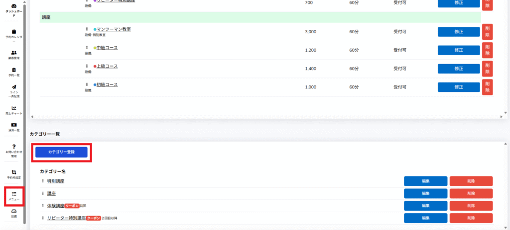 「メニュー」ページの「カテゴリー登録」からクーポンのカテゴリーを作成することができます。
