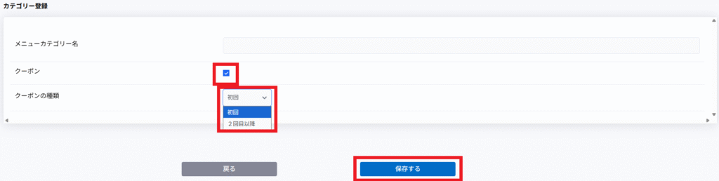 「メニュー登録」の「カテゴリー」の項目から、クーポン設定しているカテゴリーを選択し、ページ下部の「保存する」を押すことで、保存が完了し、クーポンメニューの作成が完了します。