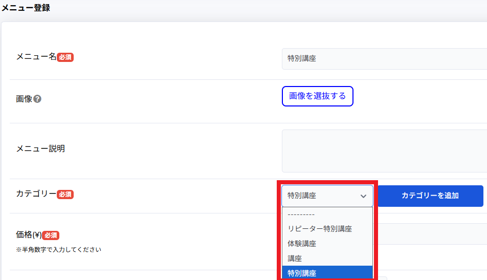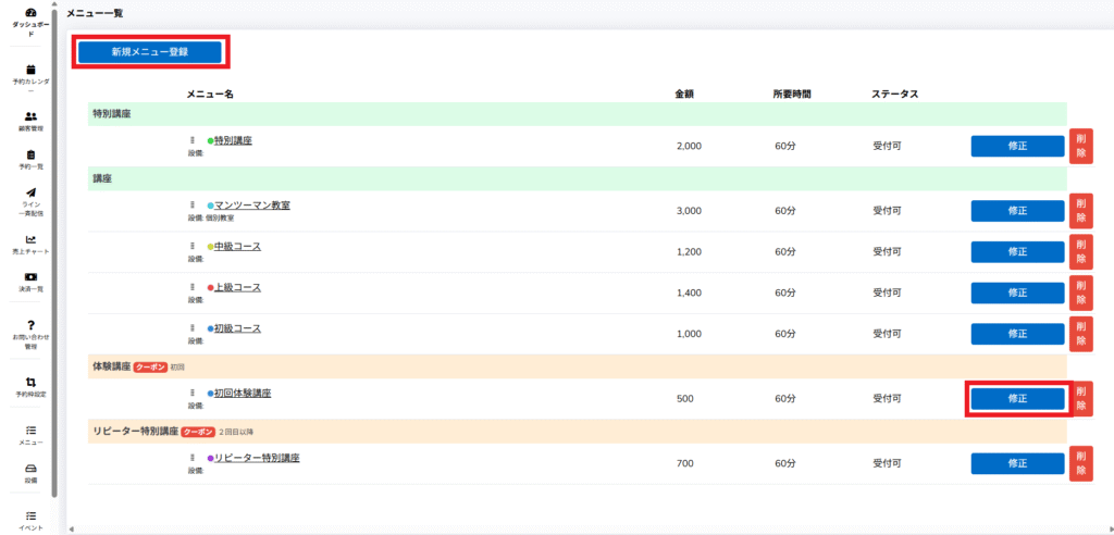 「メニュー」ページの「新規登録」もしくは「修正」から「メニュー登録」を表示します。
