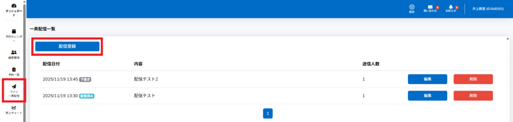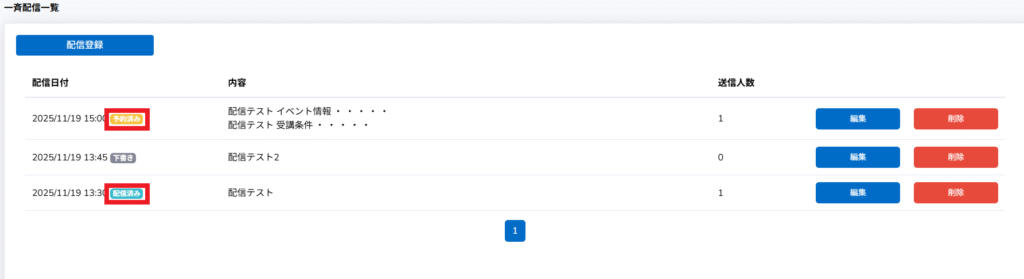 「一斉配信一覧」に「予約済み」として「配信登録」したものが表示されます。