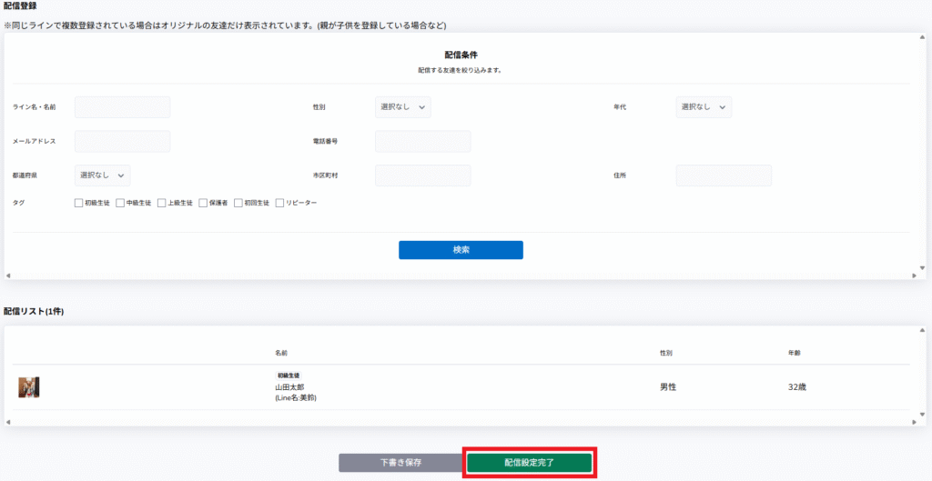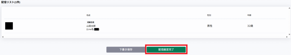 「配信リスト」に送信したい人物が表示されていることを確認し、「配信設定完了」を押すことで「配信登録」が完了します。