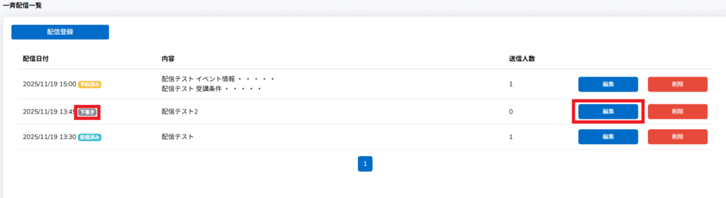 「下書き」のものを「予約済み」にしたい場合は、「編集」を押して「配信登録」を表示します。