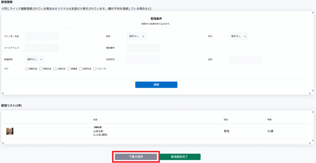 「配信登録」2ページ目の「下書き保存」を押すことで、配信予約をせずに、下書きとして保存しておくことができます。