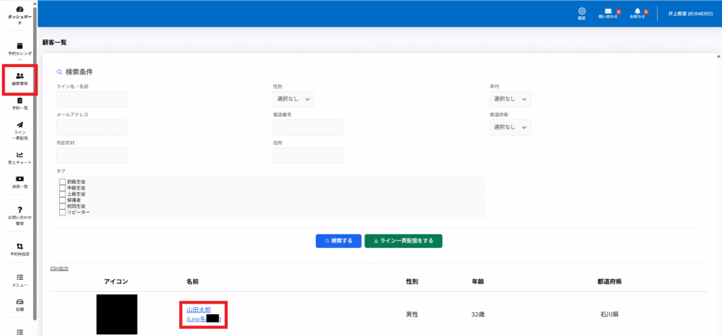 「顧客管理」メニューから「顧客名」を押し、「顧客情報」を表示します。