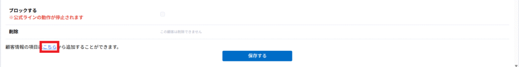 「顧客情報」ページ下部の「顧客情報の項目はこちらから追加することができます」の「こちら」を押して、「顧客情報設定」を表示します。