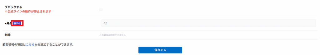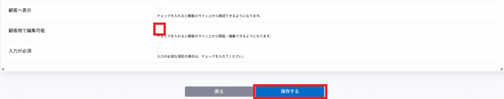 「顧客へ表示」にチェックを入れると、顧客がホームの「その他の登録情報」から確認することができる設定にすることができます。