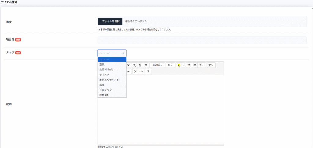 「項目名」を入力し、項目に合った「タイプ」を選択し、その項目についての説明がある場合は入力します。