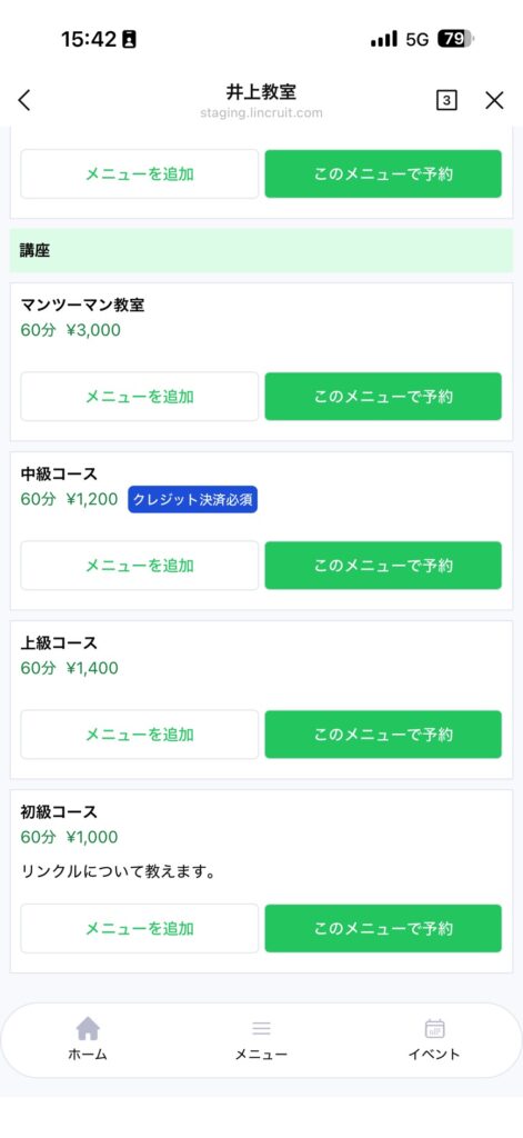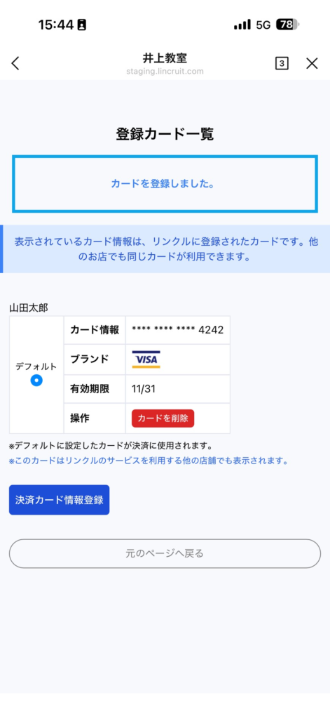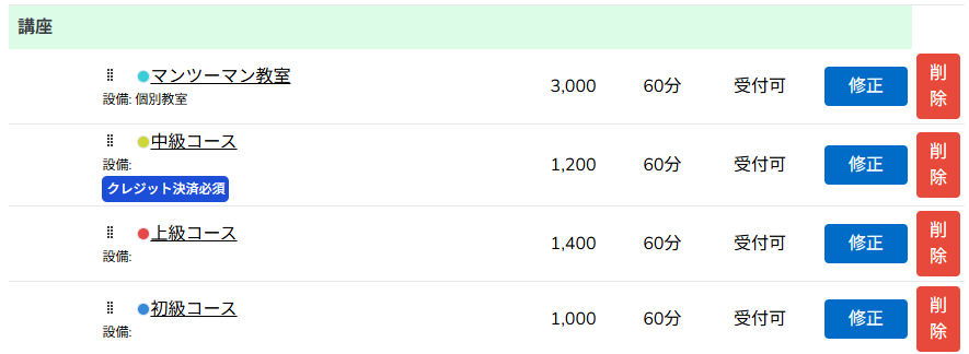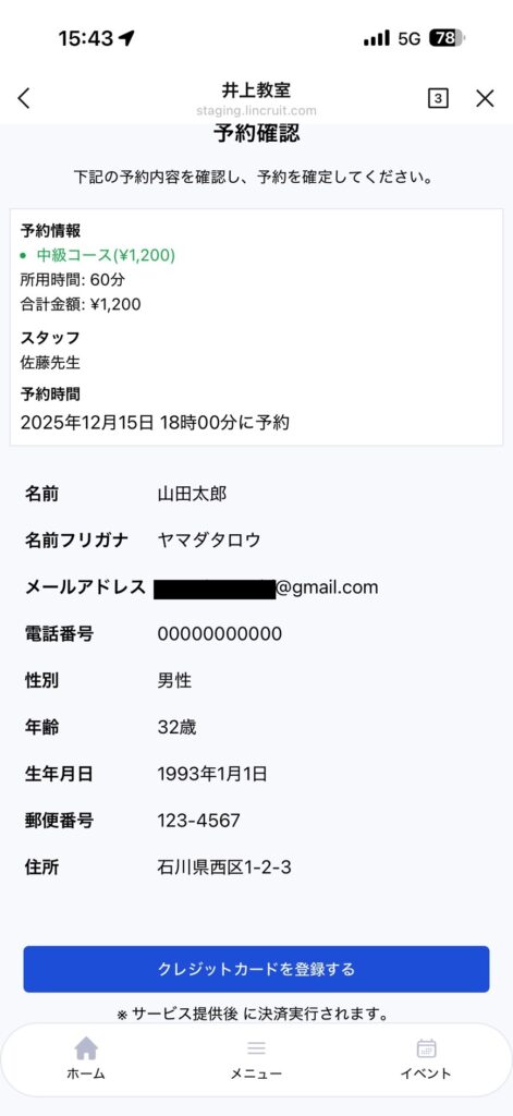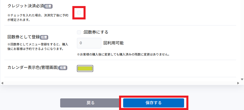 ページ下部の「クレジット決済必須」にチェックを入れて保存すると、利用者は予約時にクレジットカード登録が必須になります。