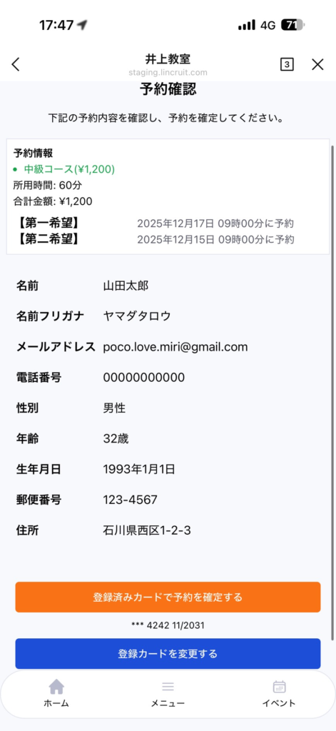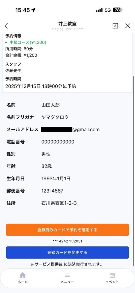 予約日時確定時に決済が実行されます。