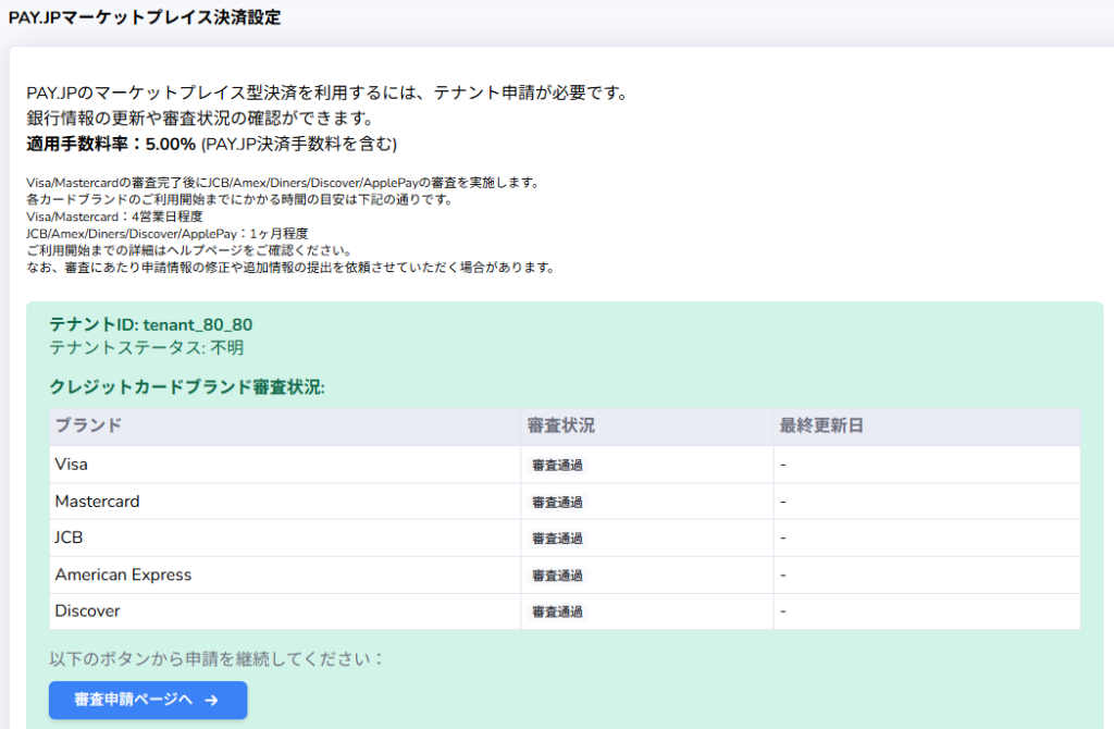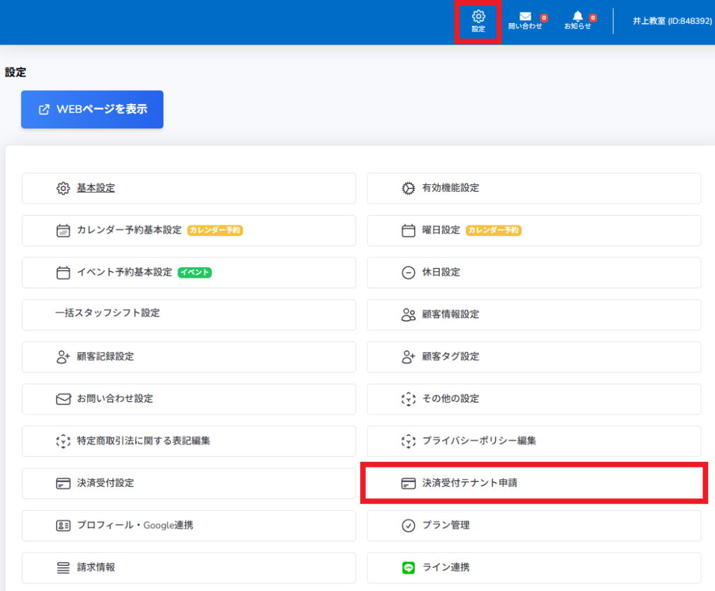 設定の「決済受け付けテナント申請」から、テナント申請を行います。