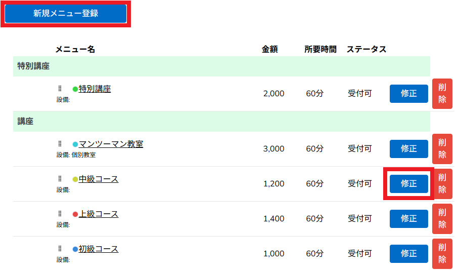 「新規メニュー登録」もしくは「修正」を押し、「メニュー登録」画面を表示します。