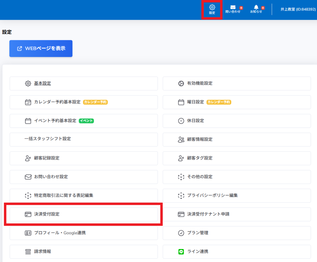 審査通過後、設定の「決済受付設定」を押して、決済設定を表示します。
