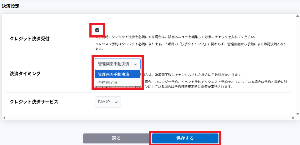 「クレジット決済受付」にチェックを入れ、「決済タイミング」を選び、保存することで、事前準備が完了します。