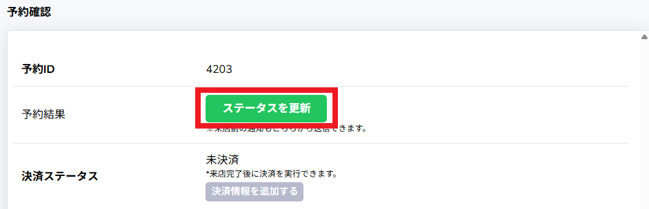 「予約カレンダー」や「顧客管理」、「予約管理」から予約者の「予約確認」画面を表示し、「ステータスを更新」を押します。