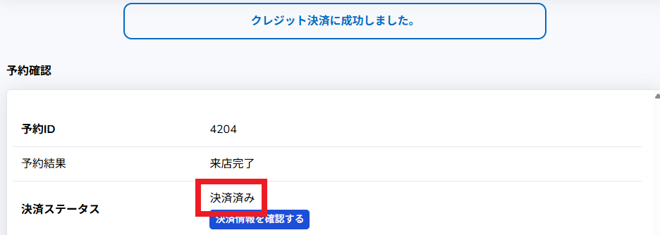 「クレジット決済に成功しました」と表示され、決済ステータスは「決済済み」になります。
